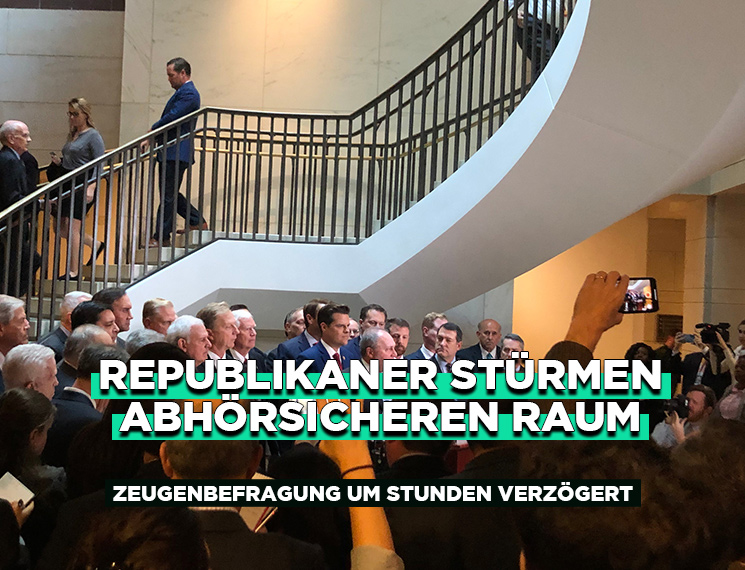 Rund 30 Republikaner stürmten gestern unerlaubt einen abhörsicheren Raum, in dem eine Zeugenbefragung durch die Oppositionspartei stattfand. Die Befragung verzögerte sich um Stunden: Dabei handelt es sich um vorbereitende Ermittlungen für das immer wahrscheinlichere Impeachment, das Amtsenthebungsverfahren gegen Trump.