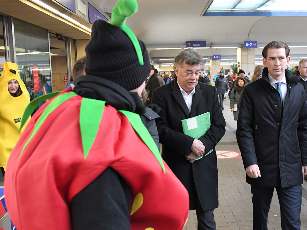 Unter großem Medienandrang spazierten Kogler, Kurz und Innenminister Nehammer durch den Westbahnhof, um dort die Polizeiinspektion zu besuchen. Schon beim Weg durch den Westbahnhof wurden sie flankiert von Polizisten. Kurz zeigte sich wieder menschennah. “Die siehst du eh jeden Tag im Fernsehen”, raunte ein aufgrund des großen Andrangs leicht entnervter Pendler seiner Begleitung zu.