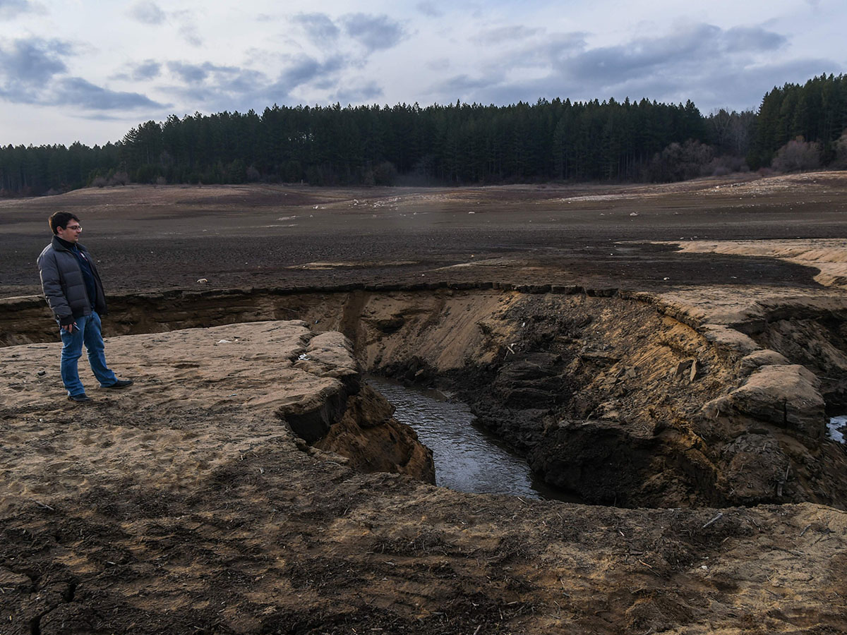 Titelbild: APA Picturedesk: Ein Mann blickt auf einen Fluss nahe der Stadt Pernik. Der nahegelegene Staudamm ist nahezu komplett ausgetrocknet, die knapp 100.000 Einwohner Perniks haben nur sechs Stunden täglich Zugang zu Wasser, das allerdings kein Trinkwasser ist.