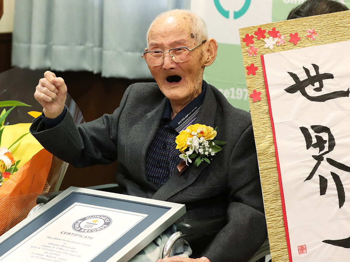 Titelbild: APA Picturedesk: Der 112 Jahre alte Chitetsu Watanabe sitzt neben dem in japanischer Kalligrafie geschriebenen “Weltweit Nummer Eins”, nachdem er als der weltweit älteste lebende Mann ausgezeichnet wurde.