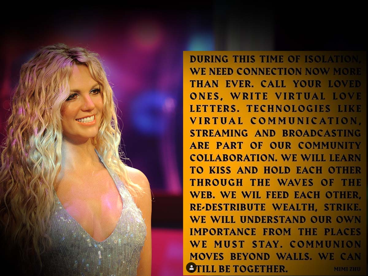 Wien, 26. März 2020 / Die Fans von US-Sängerin Britney Spears (“Ooops, I did it again”, “Hit me baby one more time”, Red.) staunten am vergangenen Dienstag nicht schlecht. Statt der gewohnten Selfies und halbmotivierenden Kalendersprüchen postete die 38-jährige einen Text der malaysischen Künstlerin Mimi Zhu. Aufgrund der Coronakrise wandte sich Spears an Ihre Fans: „In Zeiten der Isolation benötigen wir Verbindungen mehr denn je“.