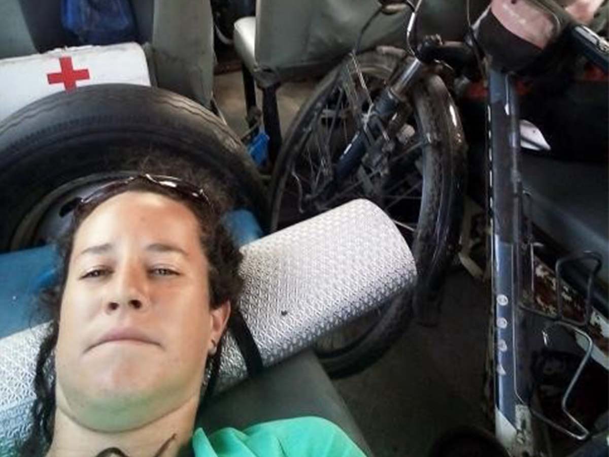 Titelbild: Yesenia Herrera Febles im Krankenwagen am Weg in ein neues Quarantäne-Quartier – zusammen mit ihrem Fahrrad.
