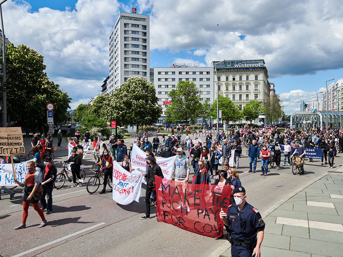 Auf den Schildern der Demonstranten war zu lesen: „Solidarität ist ansteckend“, „der Kapitalismus ist das schlimmste Virus“, „Grundrechte statt Angst“ oder „Kurz-Schluss“. Die Teilnehmer hielten sich an Sicherheitsabstand und Maskenpflicht.