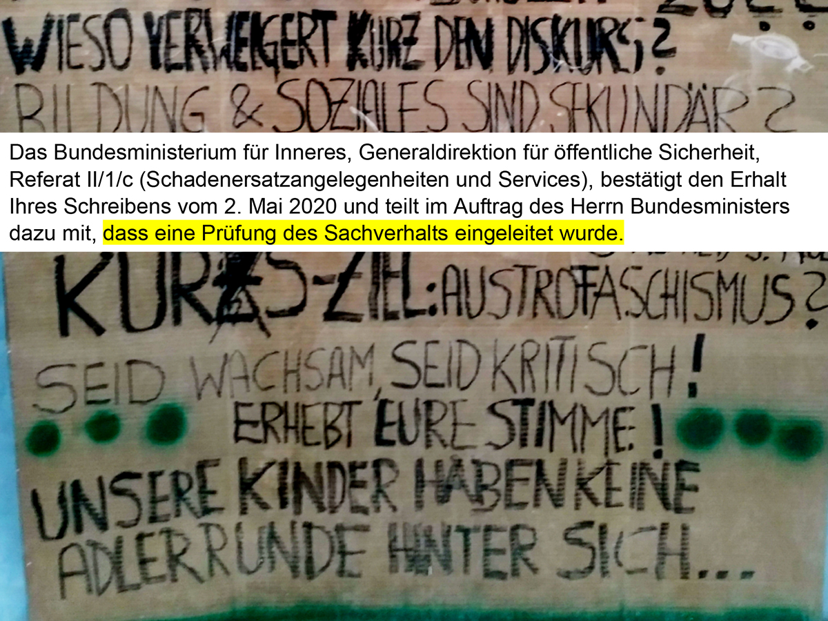 Wien/Innsbruck, 31. Mai 2020 | Die Geschichte ist dubios: Ein Polizeibeamter in zivil klingelte bei Herrn S., als dieser gerade mit Migräne zuhause in Krankenstand war. Grund des Überraschungsbesuchs waren zwei Plakate, die in Herrn S.‘ Auslagenfenstern in der Innsbrucker Innenstadt zu sehen waren. Auf ihnen hatte Herr S. seine Kritik an Sebastian Kurz, Elisabeth „Elli“ Köstinger und den Maßnahmen der Regierung stehen. Auch die Adlerrunde, das lokale Macht-Netzwerk der Tiroler ÖVP, findet in Herrn S.‘ Warnung vor Austrofaschismus Erwähnung: