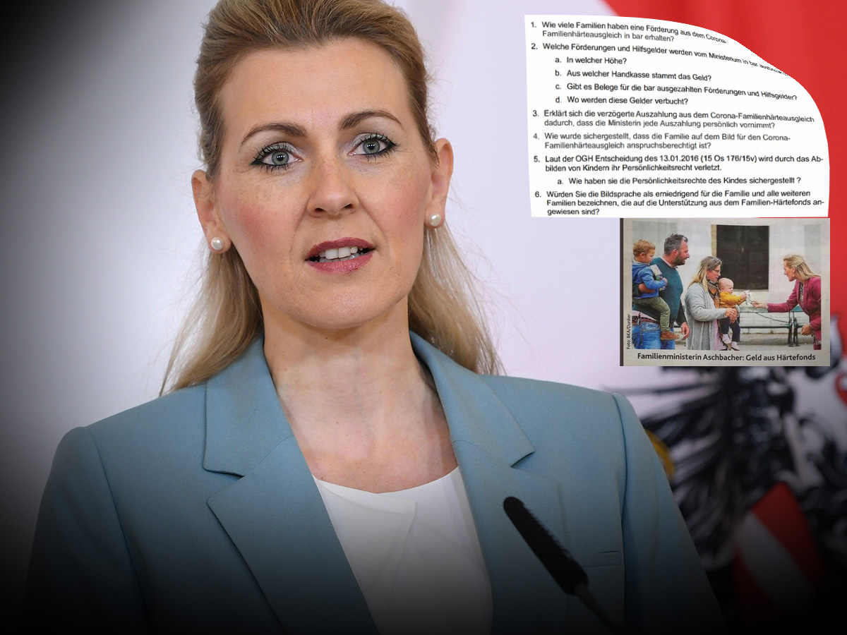 Die NEOS zweifeln an, dass es sich tatsächlich um eine echte Familie handelt und fragen deshalb, ob die Familie auf dem Bild in Wahrheit aus Schauspielern besteht. Ebenfalls ein Thema: der nicht eingehaltene Mindestabstand zwischen der Ministerin und der vermeintlichen Familie und die Frage, ob die Hygienemaßnahmen bei der Übergabe der Bargeldnoten eingehalten wurden.