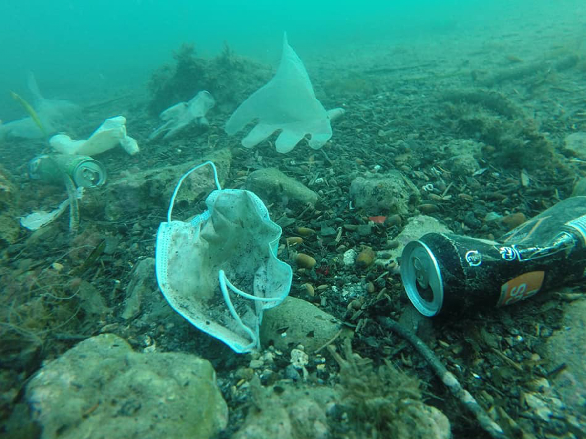Taucher der Organisation fanden „Covid Waste“ – Dutzende von Handschuhen, Masken und Händedesinfektionsmittel-Flaschen unter dem sonst üblichen Abfall wie Einwegbechern oder Alu-Dosen.