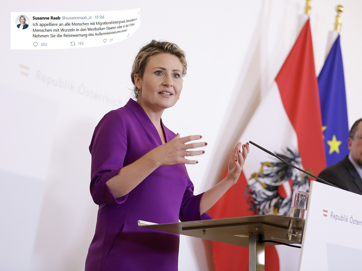 Bemerkenswert ist das schon: In Österreich ?? richtet sich die Frau Bundesministerin Raab (ÖVP) nur an Menschen mit Migrationshintergrund. Gilt die österreichische Reisewarnung etwa nicht für alle Menschen, die auf den Balkan und in die Türkei reisen?