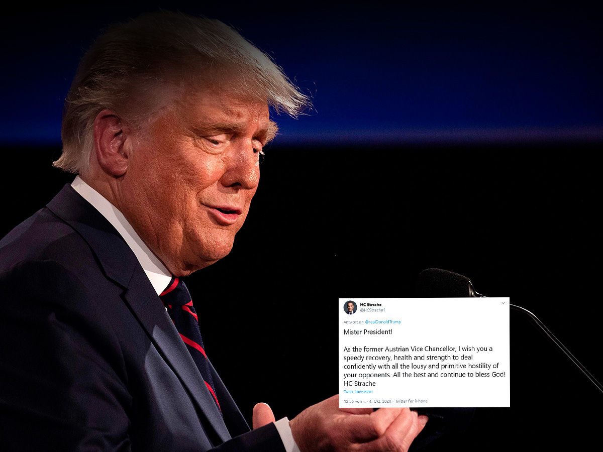 Wien, 05. Oktober 2020 | Wien-Wahl trifft auf Donald Trump. Die Erkrankung des US-Präsidenten veranlasste “THC”-Spitzenkandidaten Heinz-Christian Strache dazu, Trump Genesungswünsche zu schicken. Allerdings muss man das Englisch des Ex-Vizekanzlers erst einmal entziffern. Strache beginnt seine holprige Mitteilung an den Präsidenten forsch: „Mister President!“. Auf das höfliche „dear“ davor verzichtet der um den Einzug in den Gemeinderat kämpfende Strache. Strache – “former Austrian Vice Chancellor” (ehemaliger österreichischer Vizekanzler) – wünscht Trump daraufhin eine „speedy recovery“ und „viel Kraft, um mit den lausigen und primitiven Feinseligkeiten seiner Gegner“ umzugehen.