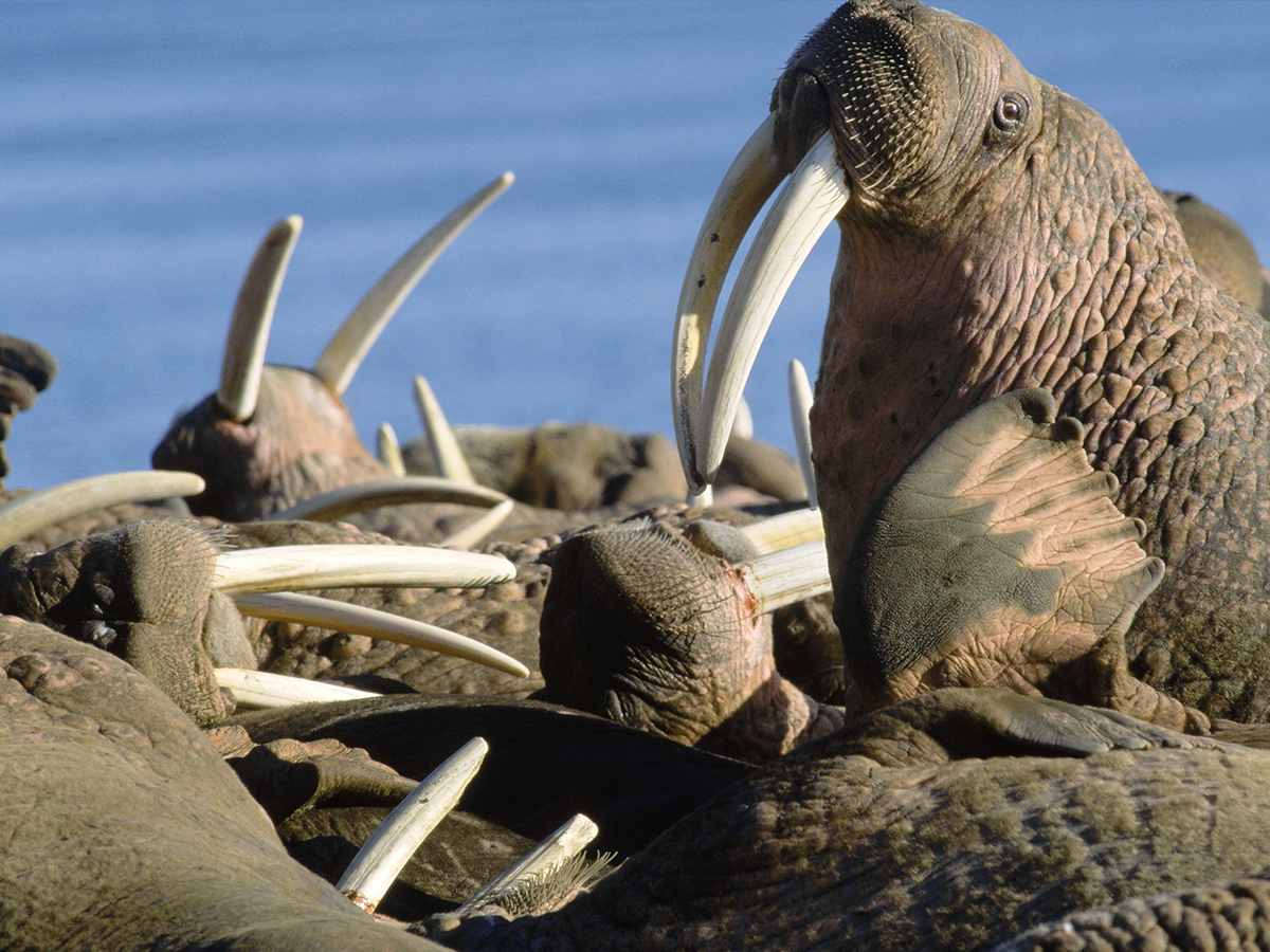 Walrosse gehören zu Raubtieren: Sie werden etwa dreieinhalb Meter lang, können mehr als 1.200 Kilogramm schwer und bis zu 40 Jahre alt werden. Die Tiere befinden sich auf der roten Liste der gefährdeten Arten: sie sind durch den Klimawandel bedroht.