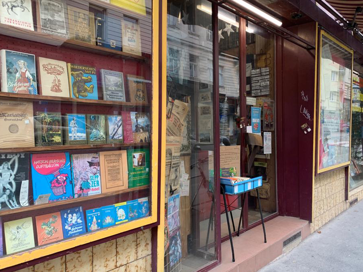Der Buchhandel ist auf kreative Lösungen angewiesen: Die antiquarische Buchhandlung “Bücher-Ernst” im 6. Wiener Gemeindebezirk hält ihre Kunden mit gratis Büchern bei Laune und hofft auf Unterstützung nach dem Lockdown. Foto: ZackZack
