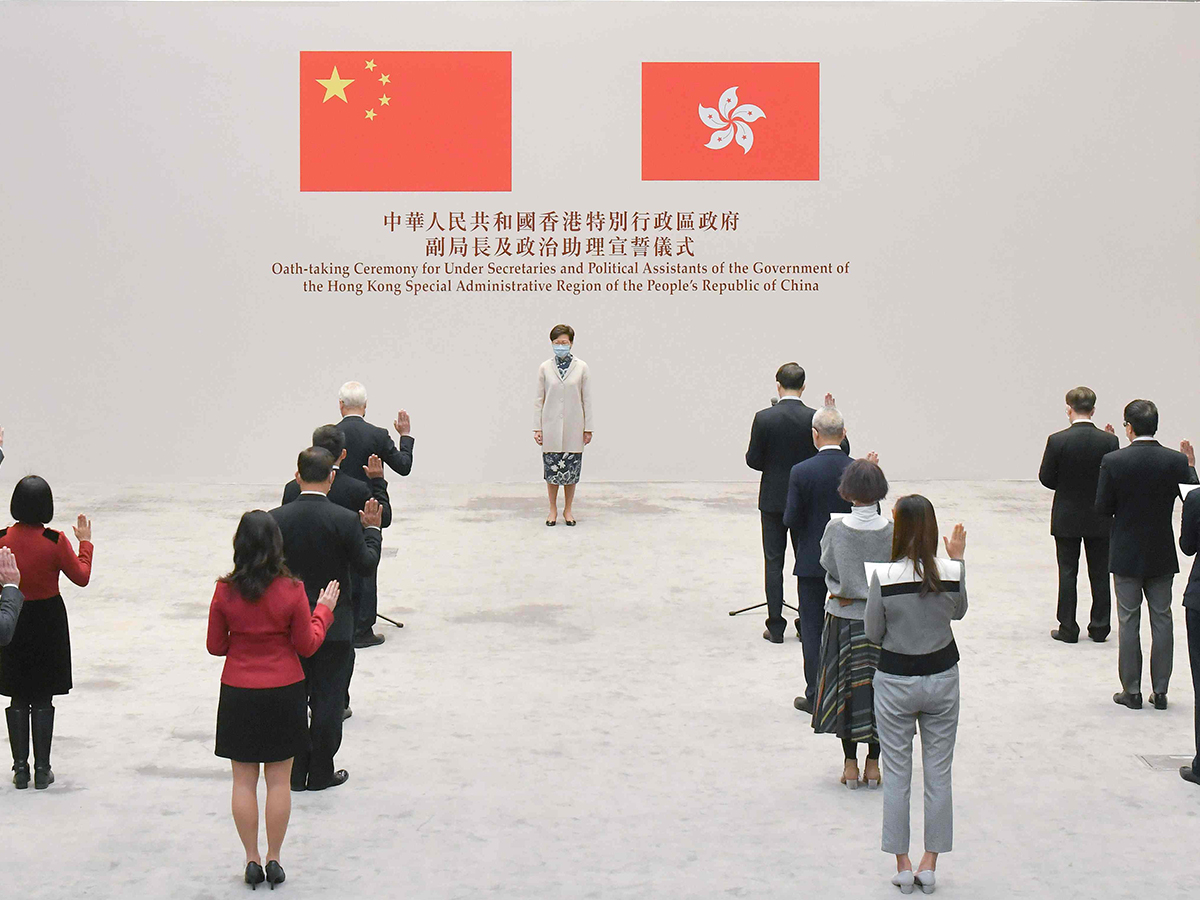 26名香港官员在行政长官林郑月娥的见证下,集体宣誓拥护基本法和效忠香港特别行政区。所有现职公务员也被要求签署相关声明。主管部门官员称,若不签署,将要求该人士离开公务员队伍。 pic.twitter.com/cSoxyhkA22