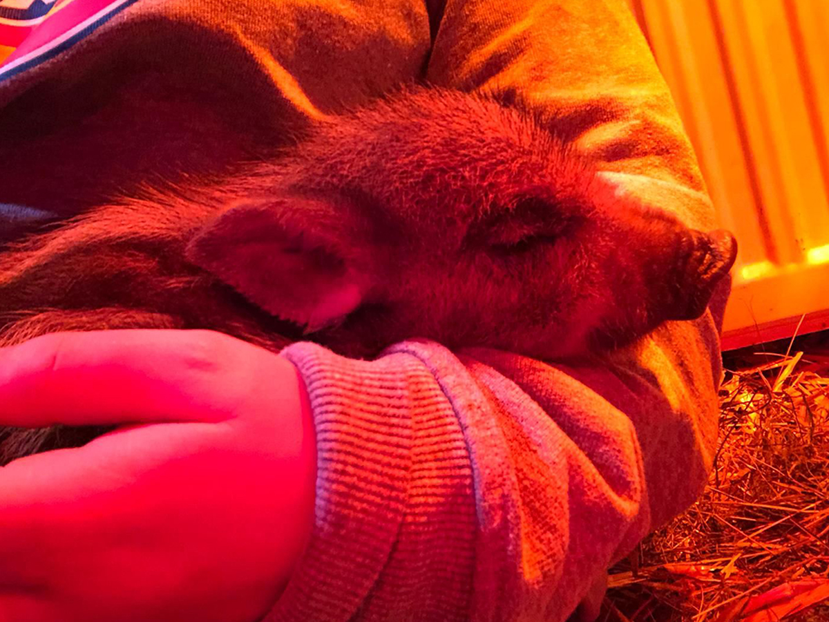 Der Babykeiler „Albert“, wie er nun genannt wird, wurde tierärztlich untersucht und ist zum Glück gesund. Er dürfte zum Zeitpunkt des Fundes nur ein oder zwei Tage alt gewesen sein. Daher wird Albert nun rund um die Uhr vom TSA-Pflegeteam betreut. Das bedeutet unter anderem: alle zwei Stunden ein Fläschchen mit Aufzuchtmilch und ganz viel Körpernähe und Liebe seiner Pflegerinnen und Pfleger, die der kleine Eber auch dankbar annimmt. Apropos Fläschchen: Sein Appetit ist ausgezeichnet. Er weckt seine Adoptiveltern immer pünktlich mit einem Nasenstupser, wenn es Zeit für die nächste Ration ist.