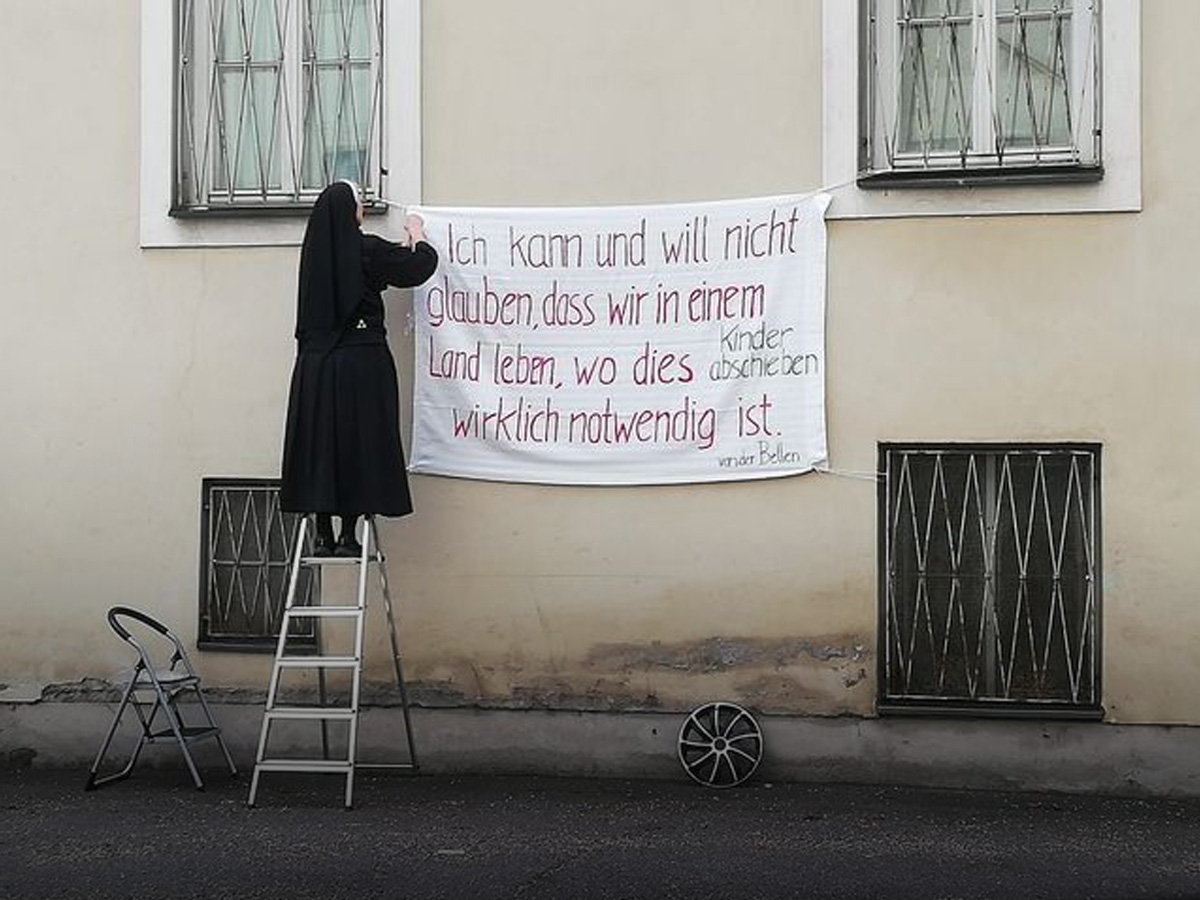 Das Echo war groß, als die Tertiarschwestern in Hall die Abschiebungen der Kinder mit einem Plakat kritisierten. Die Initiative “Courage – Mut zur Menschlichkeit” hat dazu eine kurze Video-Serie mit einer Schwester produziert. Vandalen rissen indes das ÖVP-kritische Plakat von der Wand.