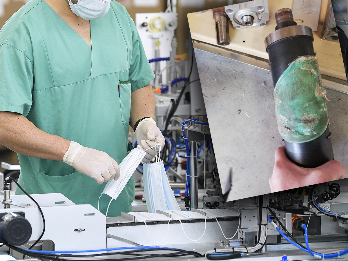 Auf zugespielten Bildern sieht man stark verschmutzte Teile einer Maschine. Unter anderem die Schneidwalze, die die Masken aus dem Band schneidet. Diese Teile würden mit jeder einzelnen Maske in Berührung kommen.