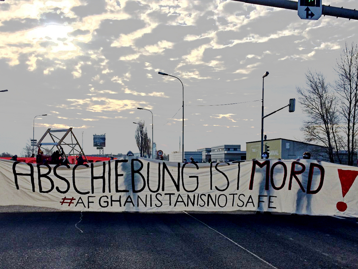 Ca. 45 Menschen sollen jetzt nach Afghanistan abgeschoben werden. Afghanistan ist nicht sicher. Aktivist*innen stellen sich quer. Die Blockaden dauern an. #w3003 #Bleiberecht pic.twitter.com/DBIH7Bje7n