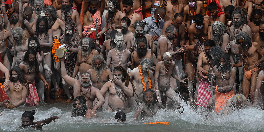 Die Hindus feiern, beten und baden im heiligen Fluss Ganges. Ihrem Glauben nach, befreien sie sich beim Eintauchen in den Fluss von ihren Sünden. Das Ritual findet in der nordindischen Stadt nur alle zwölf Jahre statt. Offiziellen Schätzungen zufolge kamen allein am Montag 3,5 Millionen Menschen, dicht an dicht gedrängt, ohne Maske.