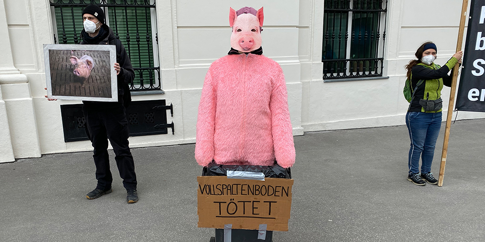 So sterben laut Angaben des VGT pro Jahr 700.000 Schweine in Österreich an den Haltungsbedingungen auf Vollspaltenboden. Es gäbe Abhilfe dagegen: das Verbot des Vollspaltenbodens, verbunden mit verpflichtender Stroheinstreu und mehr Platz für die Tiere, wurde vom am Dienstag zurückgetretenen Tierschutzminister Rudi Anschober (Grüne) vorgeschlagen, aber von Landwirtschaftsministerin Elisabeth Köstinger (ÖVP) bis jetzt blockiert. Der Verein fordert das Verbot seit mehr als 25 Jahren, wurde bis jetzt laufend vertröstet. Es liege jetzt am neuen zuständigen Minister, Wolfgang Mückstein, hier endlich was weiterzubringen.