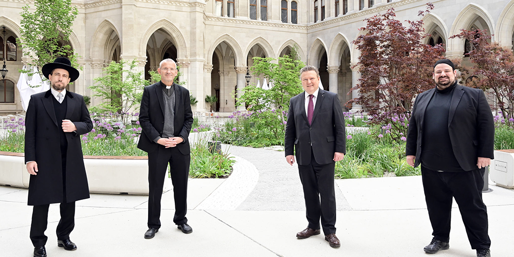 Schlomo Hofmeister (links), Michael Ludwig (Mitte), Ramazan Demir (mittig rechts), Nikolaus Krasa (rechts).  Credit: PID/Christian Jobst, zVg Michael Ludwig Facebook.