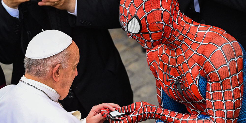 Vatikan, 23. Juni 2021 | Der Mann, der bei schwüler Hitze ein Ganzkörperkostüm trug, animierte auch eine anwesende Schüler-Gruppe zum Jubeln. Gegen Ende der Veranstaltung begrüßte Papst Franziskus den “Spiderman” und erhielt eine Superhelden-Maske als Geschenk, wie “Kathpress” berichtete.