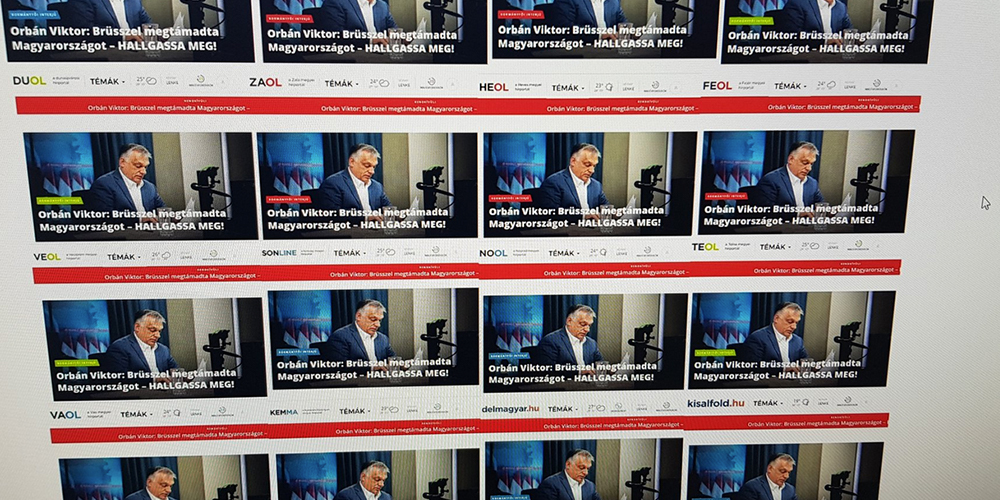 Das wurde auch am Freitagvormittag sichtbar, als auf allen Titelblättern und Online-Startseiten der gleiche Titel “Brüssel attackierte Ungarn” zu lesen war. Dazu gab es überall das gleiche Bild des Premiers. Der ORF-Osteuropa-Korrespondent Ernst Gelegs veranschaulichte die Orban-Regionalmedien-Show am Freitag in Form eines Tweets, der 16 idente Titelgeschichten nebeneinander zeigt. “Und das nennt die Orban-Regierung ‘Medienvielfalt'”, kommentiert Gelegs zusätzlich.