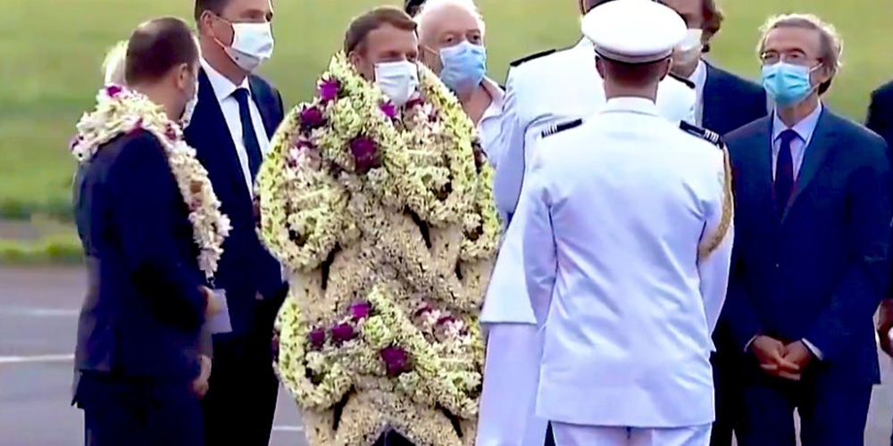 Beim Besuch von Emmanuel Macron in Französisch-Polynesien wurde der Präsident zum wandelnden Blumenstrauß. Video und Bild sind allerdings Fake. Haufenweise Nutzer fielen darauf rein.