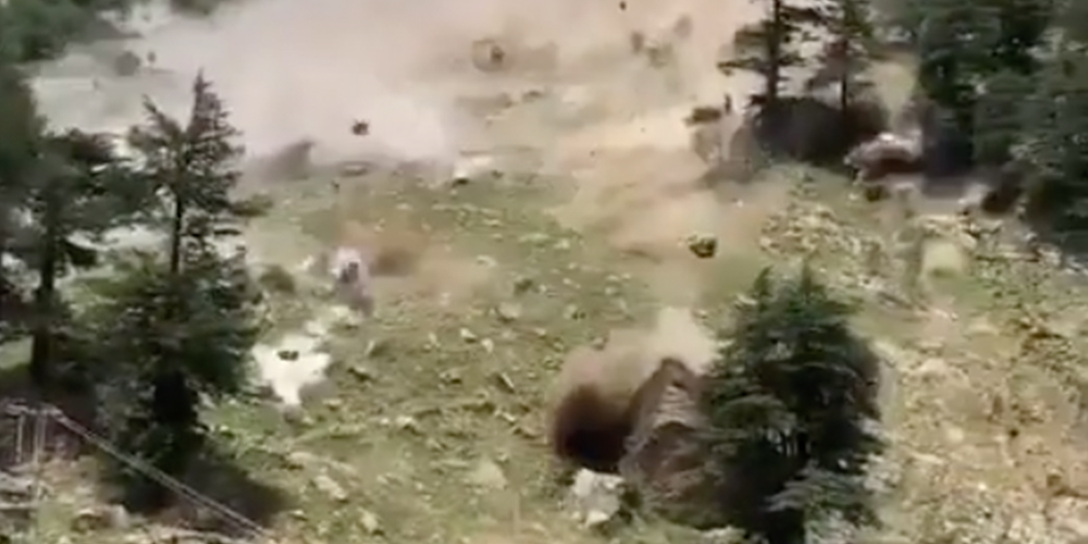 Der Sprecher der indisch-tibetischen Grenzpolizei postete auch ein Video, das jemand von einer Terrasse am Fuße des Gipfels gemacht hat. In diesem ist zu sehen, mit welcher Wucht die teils riesigen Felsbrocken vom Berg hinunterkrachen. Die Steinlawine reißt dabei alles mit, was ihr in die Quere kommt, auch der Einsturz einer Brücke ist zu sehen.