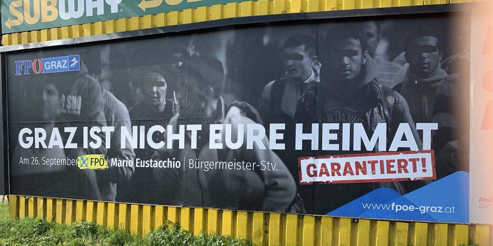 Wien, 17. September 2021 | Am 26. September wählt Graz. Die neueste Plakatkampagne der FPÖ provoziert so knapp vor der Wahl besonders stark. Ein Schwarz-Weiß-Bild zeigt mutmaßlich flüchtende Männer. Die Partei von Vizebürgermeister Mario Eustacchio legte zudem einen schwarzen Balken über die Augen der Abgebildeten. Bildtext dazu: „Graz ist nicht eure Heimat! Garantiert!“