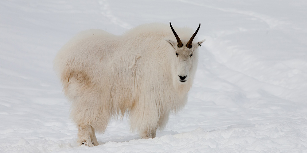 Kanadische Bergziegen sehen mit ihrem dichten weißen Fell wie große Gespenster mit schwarzen Hörnern aus. Sie können bis zu 125 Kilogramm schwer werden, ihre Hörner bis zu 30 Zentimeter lang. Sie sind bekannt für ihre außergewöhnlichen Felskletterkünste und bewegen sich bevorzugt Berghänge hinauf und hinunter. Ihr Weidegebiet überschneidet allerdings manchmal auch den Lebensraum der Grizzlybären, was üblicherweise zu tödlichen Begegnungen für die Paarhufer führt.