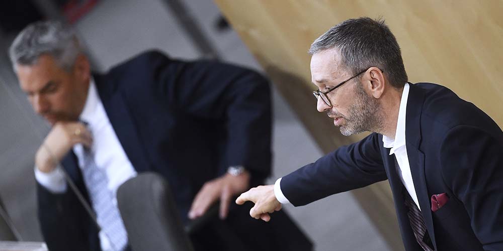 In der Flüchtlingspolitik attestierte er dem FPÖ-Chef, als einzige Aktion ein Schild in Traiskirchen umgemalt zu haben. Nehammer gab sich in der Sache betont hart und geißelte die EU-Kommission, falsche Signale mit einer Vermischung aus Migration und Asyl auszusenden. Die Flüchtlingspolitik der Union sei gescheitert. Es brauche neue Allianzen für ein Umdenken und nicht wie die FPÖ Drohgebärden, die man gar nicht umsetzen könne.