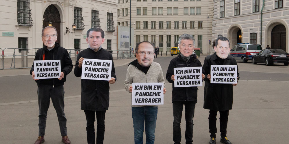 Wien, 22. November 2021 | Bei der Aktion vor dem Bundeskanzleramt wurden Personen mit Masken von Regierungsmitgliedern abgelichtet, die Schilder trugen mit der Aufschrift: “Ich bin ein Pandemie-Versager”.
