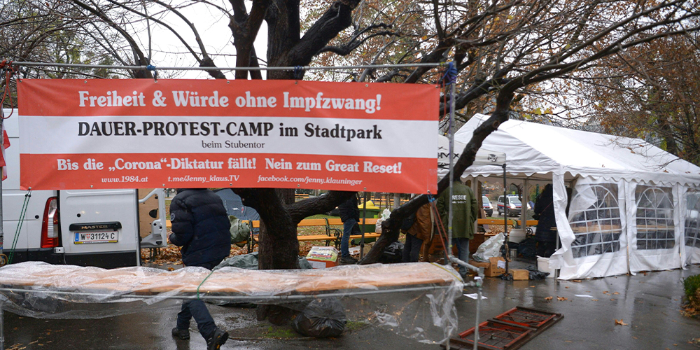 Das Camp hatte die bekannte Verschwörungstheoretikerin Jennifer Klauninger organisiert. Laut Informationen der APA war sie auch unter jenen vier Personen, die sich bis zum Schluss weigerten, das Camp aufzulösen. Seit 8. November hatten die Aktivisten den Stadtpark besetzt, dutzende Zelte wurden aufgebaut, immer wieder Lagerfeuer entfacht, Verschwörungs-Theorien verbreitet. Masken trug keiner der Teilnehmer. Laut Polizei wurden zahlreiche Anrainer und Parkbesucher belästigt, auch von einer nahegelegenen Schule langten Beschwerden ein, dass Schulkinder von den Demonstranten “in aufdringlicher Weise mit bedenklichen Inhalten bedrängt und belästigt” worden sein sollen. Dass seit Montag in ganz Österreich der Lockdown galt, war im Stadtpark nicht wahrnehmbar.