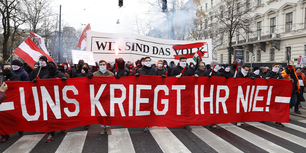 Anders sieht es in Österreich aus. Bei den Köpfen der Bewegung handelt es sich fast durchwegs um Rechtsextreme. Organisiert werden die großen Kundgebungen in Wien unter anderem von Martin Rutter, ehemaliger BZÖ-Spitzenkandidat und Redner beim neonazistischen Ulrichsbergtreffen in Kärnten, Hannes Brejcha, Vertrauter von Neonazi Gottfried Küssel, und Jennifer Klauninger, die eine Regenbogenfahne auf der Bühne zerriss und bei der neonazistischen Partei des Volkes (PdV) aktiv war. Für die große Mobilisierung sorgt aber außer den Genannten vor allem die rechtsextreme FPÖ und ihr Parteichef Herbert Kickl.