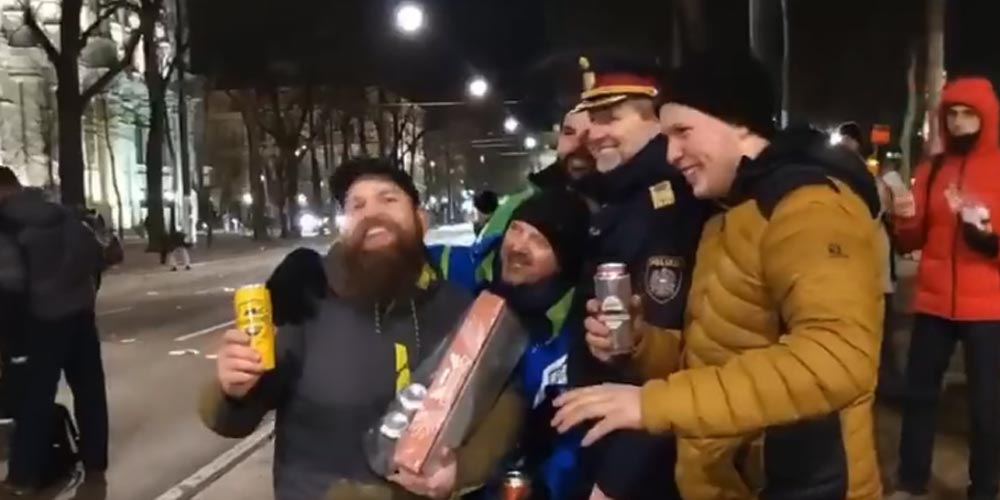 Wien, 10. Jänner 2022 | Wie fast jeden Samstag demonstrierten am vergangenen Wochenende Impfgegner in der Wiener Innenstadt. Dabei entstand ein Video, das einen hochrangigen Polizisten zeigt, wie er eng umschlungen mit Demonstranten posiert. Die Regeln zu Maskenpflicht und Abstand hält er dabei nicht ein. Wie eine längere Version des Videos zeigt, dürfte auch ein zweiter Beamter, der auf den Auslöser drückte, an der Aktion beteiligt gewesen sein.