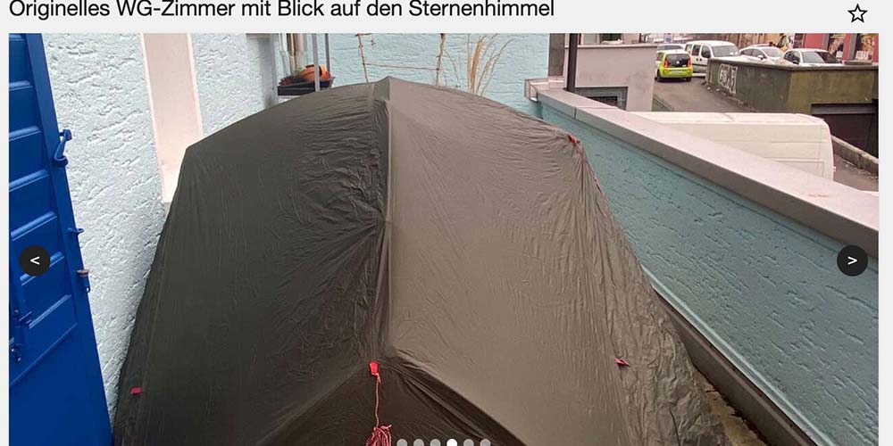 Diese Anzeige im Netz sorgte für Aufregung in Zürich: Ein einfaches Zelt auf einem Balkon wurde als “WG-Zimmer” zur Miete angeboten, für umgerechnet 480 Euro im Monat. Das Ziel des Inserats war jedoch nicht, einen neuen Mitbewohner zu finden.