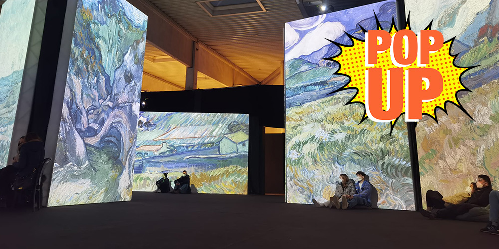 Das Besondere: Beamer projizieren die bekannten Werke auf überlebensgroße Leinwände. Begleitet von klassischer Musik begibt man sich auf einen Spaziergang durch gemalte Landschaften, die keineswegs statisch bleiben, sondern in animierten Übergängen ineinanderfließen. Auf Sitzsäcken kann man sich zwischen die Gemälde setzten und dem Spektakel zuschauen. In einer Halle vor der Installation bekommt man noch die grundsätzlichen Infos zum Leben des Künstlers und seinen Werken mit auf den Weg.