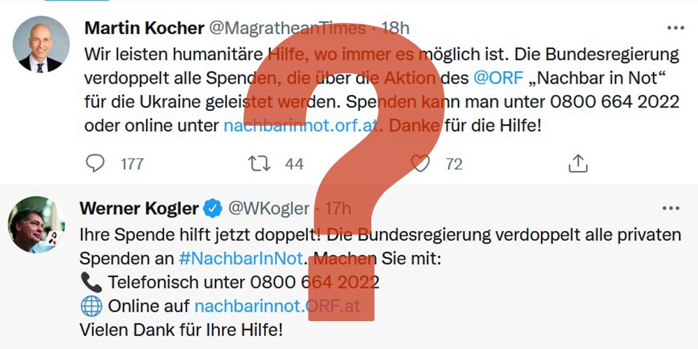 Wien, 11. März 2022 | Am Donnerstag ließ die Bundesregierung mit einer humanitären Aktion aufhorchen: Die Regierung würde alle Spenden für die Ukraine-Hilfe von “Nachbar in Not” verdoppeln. Eine gute Sache. Doch schnell kamen Zweifel an der Redlichkeit der Ankündigung auf. “Die Bundesregierung” ist schließlich ein Kollegialorgan bestehend aus den Ministern. Würden wirklich Nehammer, Kogler & Co. Spenden verdoppeln?