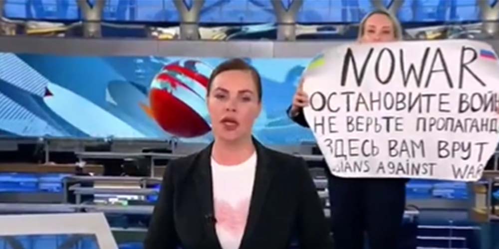 Moskau, 15. März 2022 | “Stoppt den Krieg. Glaubt der Propaganda nicht. Hier werdet ihr belogen” – Die Aufschrift ist für ein Protestschild nicht ungewöhnlich. Ungewöhnlich und riskant waren jedoch die Umstände, unter denen es hochgehalten wurde, nämlich während der Live-Übertragung der abendlichen Hauptnachrichtensendung des staatlichen russischen Fernsehsenders Kanal 1 am Montag, der Hauptnachrichtenquelle für Millionen von Russen.