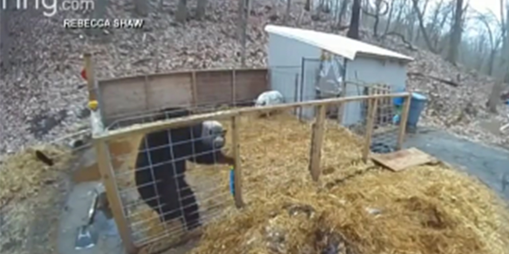 Die beiden Therapieschweine Mary und Hammy staunten nicht schlecht, als plötzlich ein Schwarzbär über den Zaun ihres Geheges kletterte. Doch statt sich kampflos zu ergeben, verjagten die Beiden den Eindringling. Die Überwachungskamera fing das Schauspiel ein.