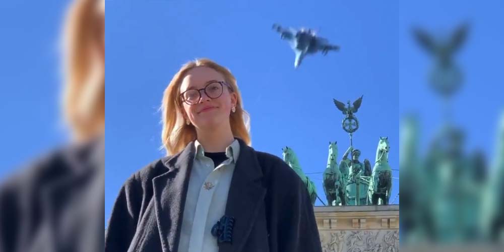 Eine Frau posiert vor dem Brandenburger Tor für ein Foto. Plötzlich fliegt ein Kampfjet mit vollem Karacho vorbei, dann knallt es. Die Kampagne hinter dem täuschend echt wirkenden Video spaltet derzeit das Netz.