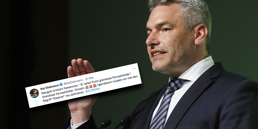 Am Dienstag rückte dann ein Berater des Bundeskanzlers aus: Kai Diekmann. Der ehemalige Bild-Chefredakteur, dessen PR-Agentur „Storymachine“ die ÖVP im Untersuchungsausschuss berät, ätzte gegen Mangott. Auf Twitter teilte er einen Screenshot des „Kurier“-Artikels über den anerkannten Russland-Experten. „’Mangott kritisiert Nehammer: ‘Er liefert Putin grandiose Fernsehbilder’. Grandiose Fernsehbilder, fürwahr. Irgendwann müssen wir mal den Begriff ‘Experte’ neu definieren.“ Das Lästern Diekmanns über Mangott kam bei den Nutzern der Social-Media-Plattform gar nicht gut an. Sein direkter Angriff auf den Wissenschaftler sorgte für einige Kritik.
