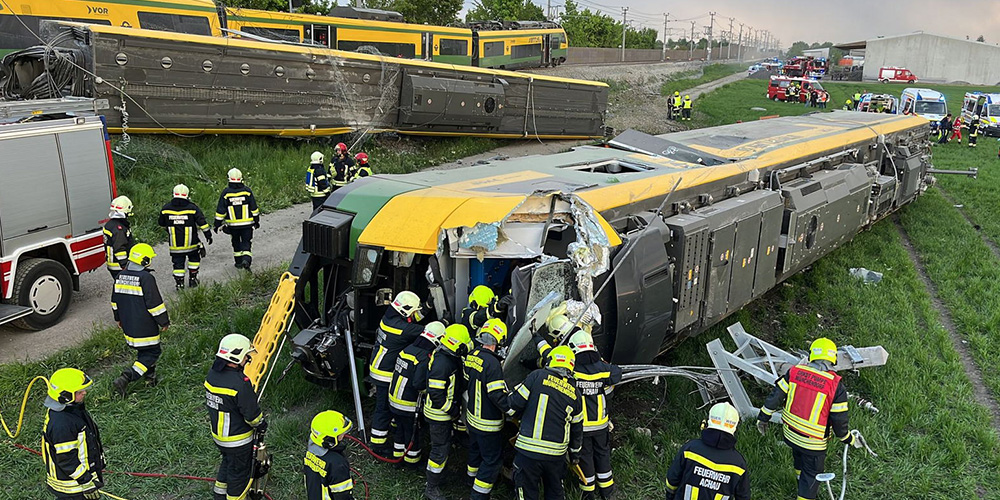 Münchendorf, am 10. Mai 2022 | Nach dem Zugsunglück auf der Pottendorfer Linie in Münchendorf (Bezirk Mödling) am Montagabend mit einem Todesopfer, drei Schwer- und neun Leichtverletzten haben am Dienstag die Erhebungen zur Klärung der Ursache angedauert. Ein “Ventus”-Zug der Raaberbahn war entgleist. Einer der sechs Wagen der Doppelgarnitur stürzte in ein Feld. Ein zweiter blieb ebenfalls seitlich auf der Böschung neben den Gleisen liegen.