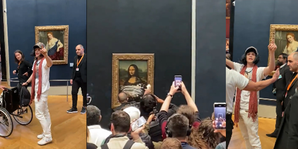 Maybe this is just nuts to me💀but an man dressed as an old lady jumps out of a wheel chair and attempted to smash the bullet proof glass of the Mona Lisa. Then proceeds to smear cake on the glass, and throws roses everywhere all before being tackled by security. 😂??? pic.twitter.com/OFXdx9eWcM