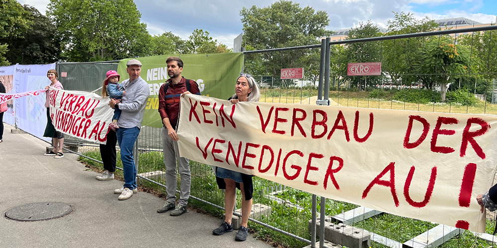 Grünen-Bezirksvorsteher-Stellvertreter Bernhard Seitz, der die spontane Demo angemeldet hatte, beginnt die Umstehenden zu animieren, Transparente „aus dem Demowagen“ zu ziehen. Der Demowagen: der mitgebrachte Kinderwagen des jungen Vaters. Kurz darauf entrollen die Demonstranten selbstgebastelte Plakate, es erklingen die ersten Rufe – und dann wird es richtig laut. „Kein Verbau der Venediger Au!“, „Pfui!“ und schrille Pfiffe hallen durch den Park, geradewegs gerichtet an die Politprominenz und die Baukönige auf der anderen Seite des Baugitters. Ihre Hände klammern sich wütend an die Baugitter.
