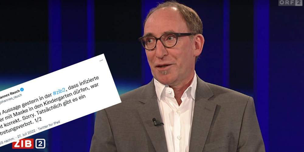 Wien, 27. Juli 2022 | Zweimal „Sorry“ von einem Minister in einer Woche hört man eher selten. Bei Gesundheitsminister Johannes Rauch war dies am Mittwoch der Fall. Nachdem er sich vergangene Woche für seine harschen Twitter-Worte entschuldigte, war es diese Woche eine Aussage in der “Zeit im Bild 2” über seine eigene Verordnung.