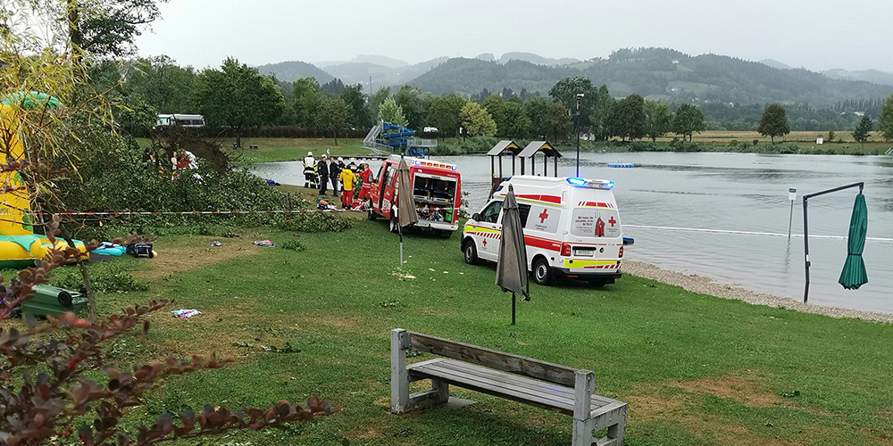 Klagenfurt/Graz | Schwere Unwetter haben am Donnerstag in Österreich fünf Menschenleben gefordert. In St. Andrä im Lavanttal in Kärnten wurden auf einem Freizeitareal am See zwei Kinder (vier und acht Jahre alt) von umstürzenden Bäumen erschlagen und 13 Personen verletzt, zwei davon schwer. Ebenfalls ein umgestürzter Baum tötete in Gaming (NÖ) drei Menschen. Schwere Schäden entstanden an der Infrastruktur, die ÖBB stellten den Verkehr in Kärnten, Osttirol und der Steiermark ein. Zahlreiche Straßen waren blockiert.