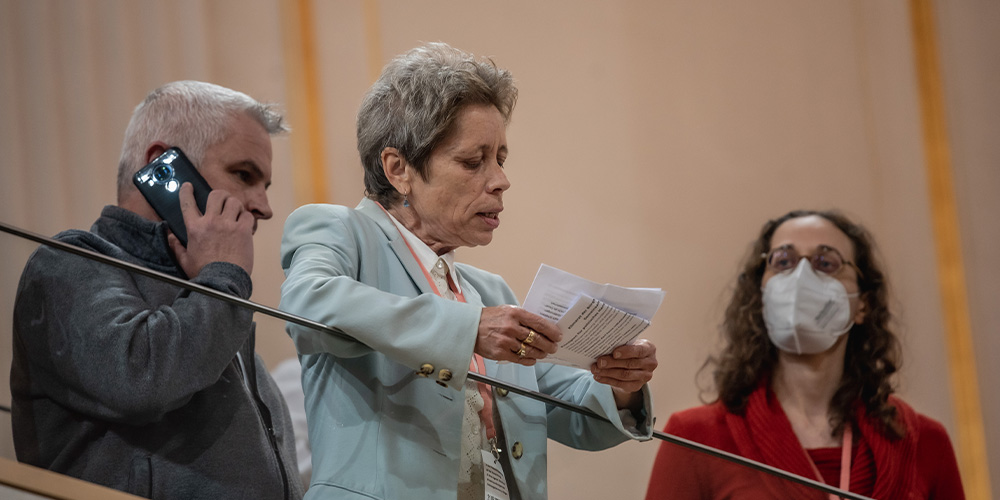 Abgeordnete mit den Flugblättern, Aktivisten auf den oberen Rängen (Bilder: Screenshot/ORF )