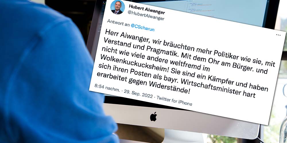 Peinlich! Ein Tweet des bayrischen Wirtschaftsministers Hubert Aiwanger lässt darauf schließen, dass er beziehungsweise sein Social-Media-Team wohl mit Fake-Accounts arbeiten.