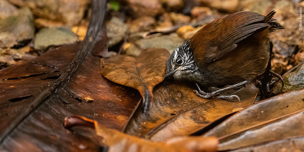 Das Titelbild zu diesem Artikel zeigt übrigens das Werk von Nick Kanakis. Ihm ist es gelungen, ein besonders scheues Exemplar vor die Linse zu bekommen: den Zaunkönig. Zu sehen ist, wie der Vogel hochkonzentriert sein Ohr auf einen Blätterhaufen drückt, um Insekten zu erlauschen.