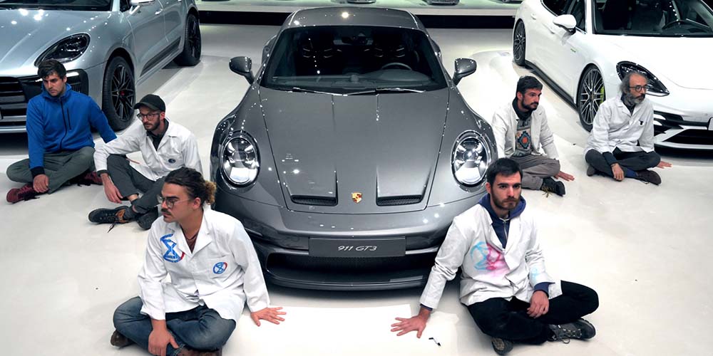 Um die Forderungen zu bekräftigen, besetzten 15 Aktivisten den Pavillon der Volkswagen-Tochter Porsche, neun klebten sich auf dem Boden vor einem Sportauto fest.
