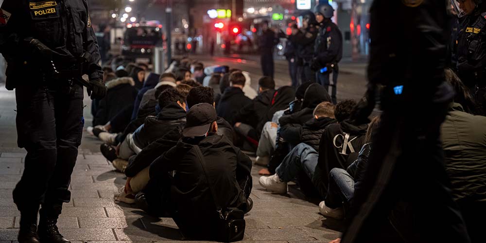 Gegen 21.00 Uhr seien die ersten Notrufe bei der Polizei eingegangen. Eine große Personengruppe, die sich am Taubenmarkt in der Fußgängerzone getroffen habe, werfe unkontrolliert Böller auf Passanten. In weiterer Folge rückte ein Großaufgebot von rund 170 Beamten aus, darunter auch Cobra-Einsatzkräfte. Die Stimmung sei angespannt und aggressiv gewesen, teilte die Landespolizeidirektion Dienstagvormittag mit. Mit zwei Sperrketten versuchten die Einsatzkräfte die Randalierer abzudrängen, dabei seien sie mit Böllern, Steinen und Glasflaschen beworfen worden.